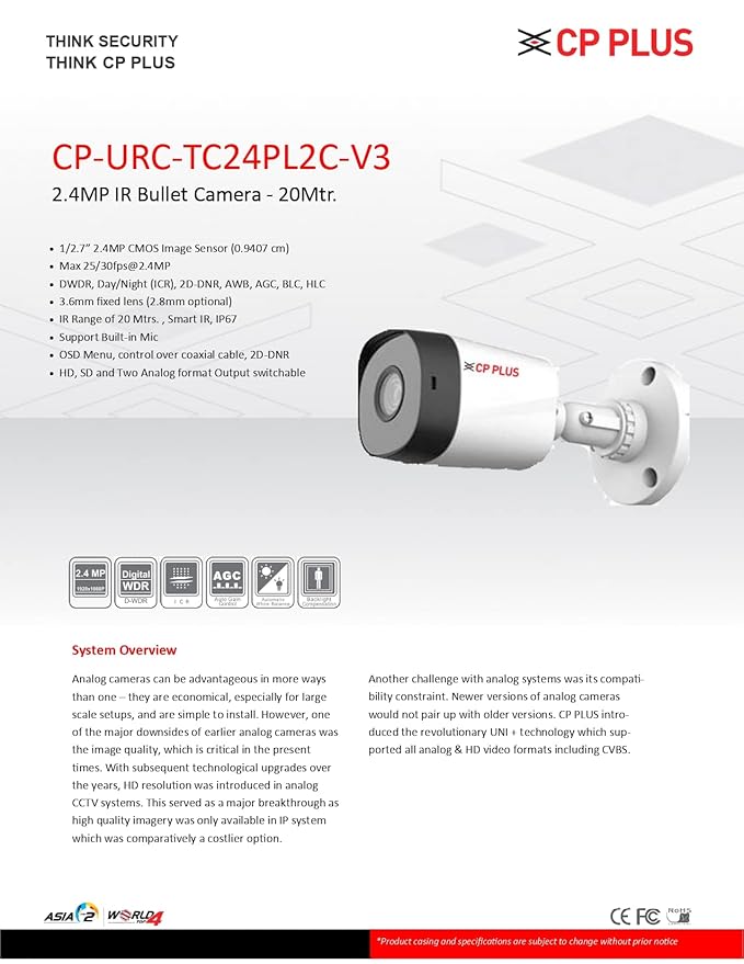 Compatible with 2 MP supporting DVR only The CP PLUS CP-URC-TC24PL2C-V3 is a 2.4MP Full HD IR bullet camera built for reliable surveillance in both indoor and outdoor environments. Featuring a 3.6mm fixed lens and advanced infrared night vision up to 20 meters, it ensures sharp images even in complete darkness. The camera supports built-in microphone functionality, allowing real-time audio capture along with video. Its IP67-rated housing makes it suitable for all weather conditions, while support for up to 30fps recording ensures smooth video playback. Ideal for homes, offices, shops, and small businesses, this camera is a smart choice for robust security coverage.